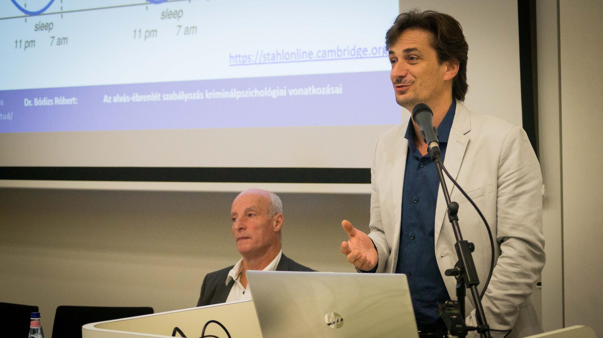 Az alvás-ébrenlét szabályozás kriminálpszichológiai vonatkozásairól Bódizs Róbert beszélt. „Az ébrenlét alváséhséget ébreszt bennünk, a ritmikus éberség miatt éjszaka szeretünk inkább aludni, alvásszerkezetünk ciklikus, nem folyamatos” – vélekedett a SOTE Magatartástudományi Intézet kutatási igazgatóhelyettese. Elmondta azt is, hogy az agresszió az alváshiánykor jelentkezhet, de az is kiváltó ok lehet, ha nem a megfelelő napszakban alszunk. Ráadásul alvás közben is követhetünk el erőszakos cselekményeket. Az Egyesült Államokat vizsgálva statisztikák bizonyítják, hogy a legtöbb bűntettet éjszaka követik el. Bódizs Róbert azt is kifejtette, hogy az alvásrutinunk akár egy órával való eltolása (óraátállítás) is szignifikáns hatást kelthet, ilyenkor több az autóbaleset, illetve bizonyított, hogy szigorúbbak a bírói döntések is. A jogi felelősség kérdése akkor merül fel, ha elkövetünk egy bűncselekményt – például alvajárás közben. Ilyenkor nagyon nehéz eldönteni, hogy az elkövetéskor ténylegesen ebben az állapotban volt-e az elkövető.