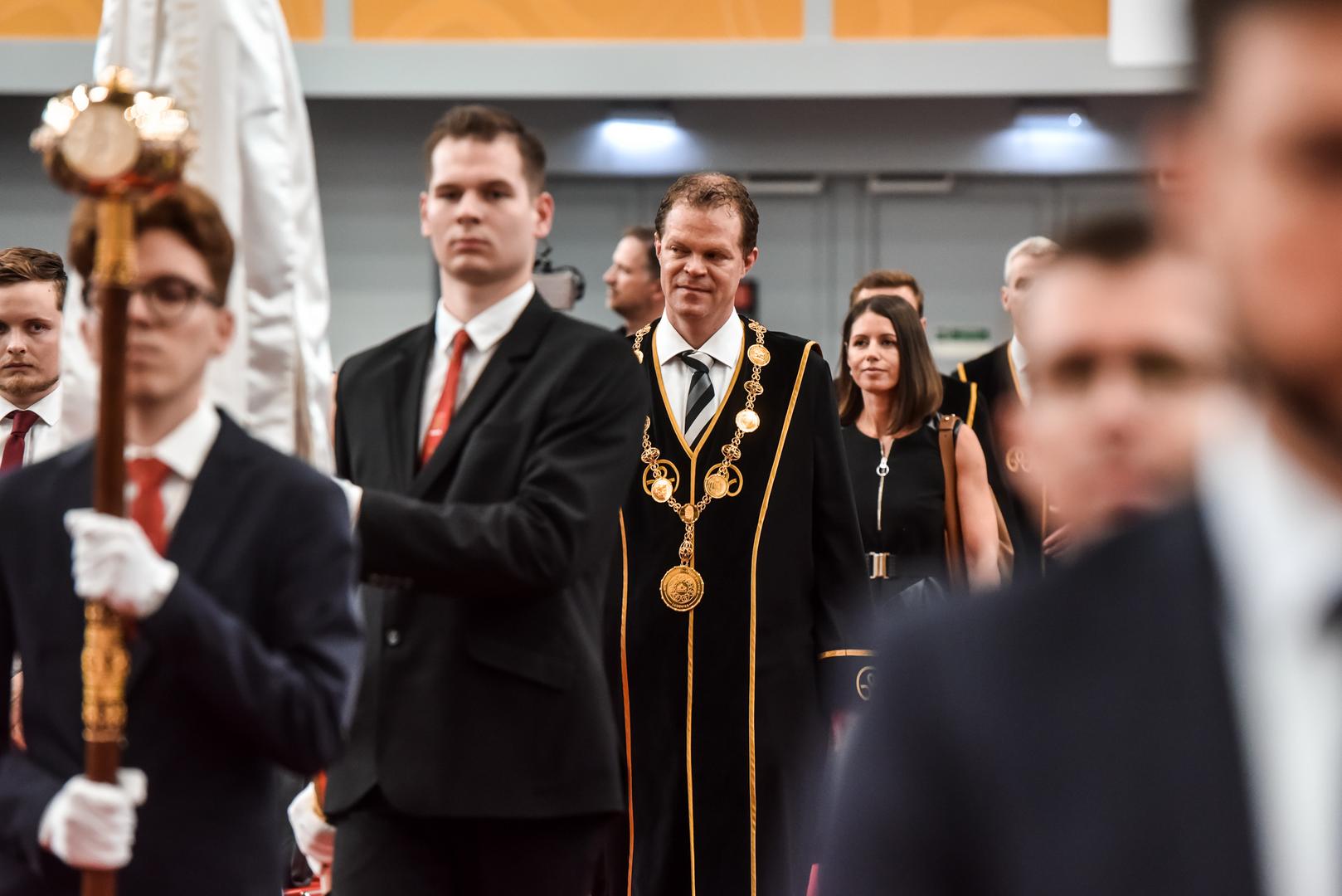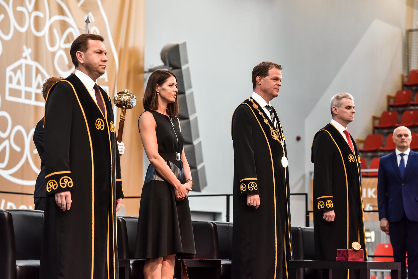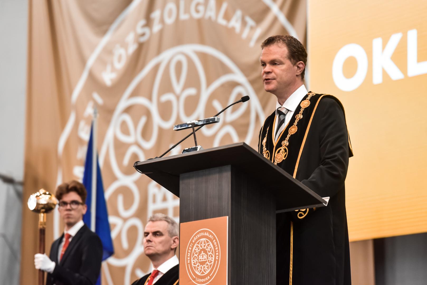 Koltay András, a Nemzeti Közszolgálati Egyetem rektora ünnepi beszédében a végzett hallgatók iránti tiszteletét fejezte ki, utalva arra, hogy ők már felnőtt korukban, jellemzően munkavégzés és családfenntartás mellett vállalták a továbbtanulást. „Bízzunk be, hogy az itt töltött idő arra is alkalmat teremtett, hogy szakmai és baráti kapcsolataikat formálják” – hangsúlyozta. A rektor hozzátette: a szakmai közösségépítés is kiemelt szerepet játszik a továbbképzések esetében, ugyanakkor tudja, hogy egy évnyi képzés rövid idő ahhoz, hogy a hallgatók mélyebben megismerhessék a Nemzeti Közszolgálati Egyetemet, de arra kérte őket, hogy a jövőben is támogassák az intézmény előrehaladását. Koltay András útravalóként úgy fogalmazott: „Önök tudják, hogy megérezni és megérteni valamit a világból, annak komplexitásából, és megtalálni benne a helyüket soha nem lezárható feladat.”