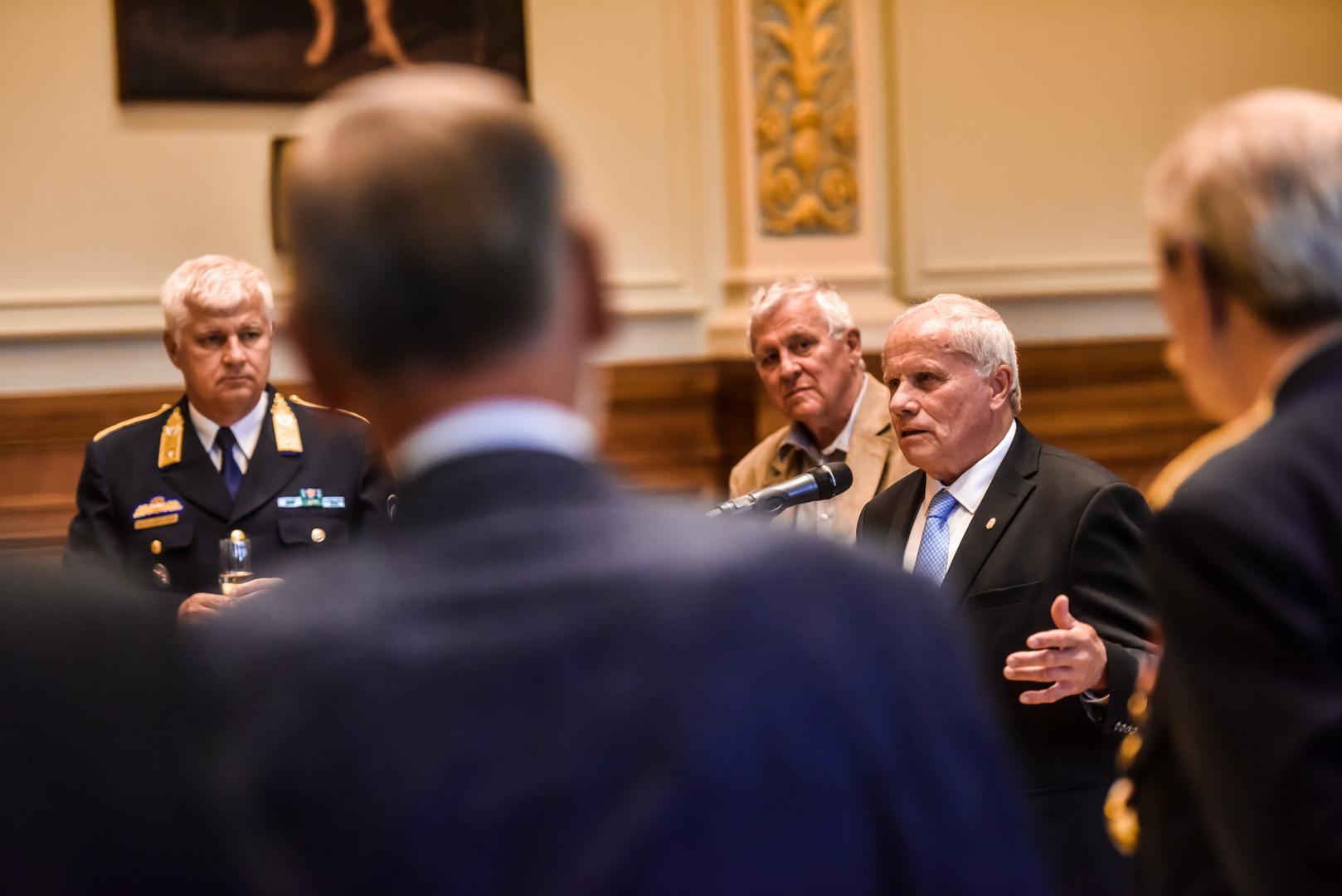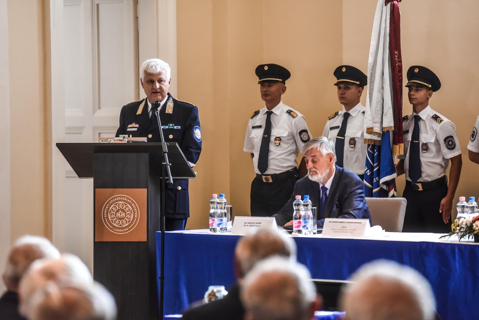 A Szent László Kápolna ünnepélyes falai között köszöntötte a résztvevőket Kovács Gábor r. dandártábornok, a Rendészettudományi Kar dékánja, aki bevezető gondolataiban az ünnepnapok és a hagyományok fontosságáról beszélt. A dékán egyebek mellett elmondta: a jubilánsok történelmi tetteket hajtottak végre és követendő példát állítottak utódaik, a Rendészettudományi Kar rendőr tisztjelöltjei és oktatói számára. Kovács Gábor dandártábornok kifejtette, hogy a jubilánsok közreműködtek „a rendőrség, a határőrség és a többi belügyi szerv átalakításában, a rendszerváltásban, a szervezetek fejlesztésében, valamint jelen voltak az informatikai átállásnál is, és így adták át a stafétabotot a következő generációnak.” A dékán szólt az NKE képzési struktúrájáról, a Campuson zajló fejlesztési munkákról, illetve arról, milyen irányba fejlődik a rendészeti felsőoktatás. Hangsúlyozta: az oktatás mellett a nevelés is kiemelt szerepet kap, mert a hallgatókat emberségre, megbecsülésre, példamutatásra, tudásvágyra és tiszteletre nevelik.