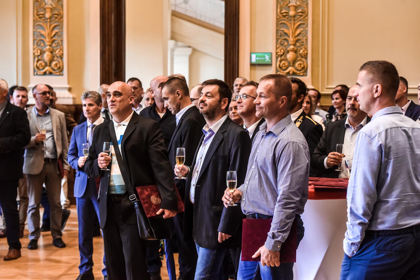 Az ünnepélyes oklevélátadókat követően pezsgővel koccintottak a jubileumi évfordulókat ünneplő résztvevők a Széchenyi Díszteremben. A rendezvénysorozat egyik eseményének állófogadásán Zsinka András, a Belügyminisztérium személyügyi helyettes államtitkára pohárköszöntőjében régi emlékeket idézett fel, és elmondta: az elmúlt ötven évben összesen 541 rendőr tisztjelölt végzett kiváló eredménnyel a Rendőrtiszti Főiskolán, vagy annak utódintézményeinek egyikében, akik közül többen ma már tábornoki vállszalagot viselnek.