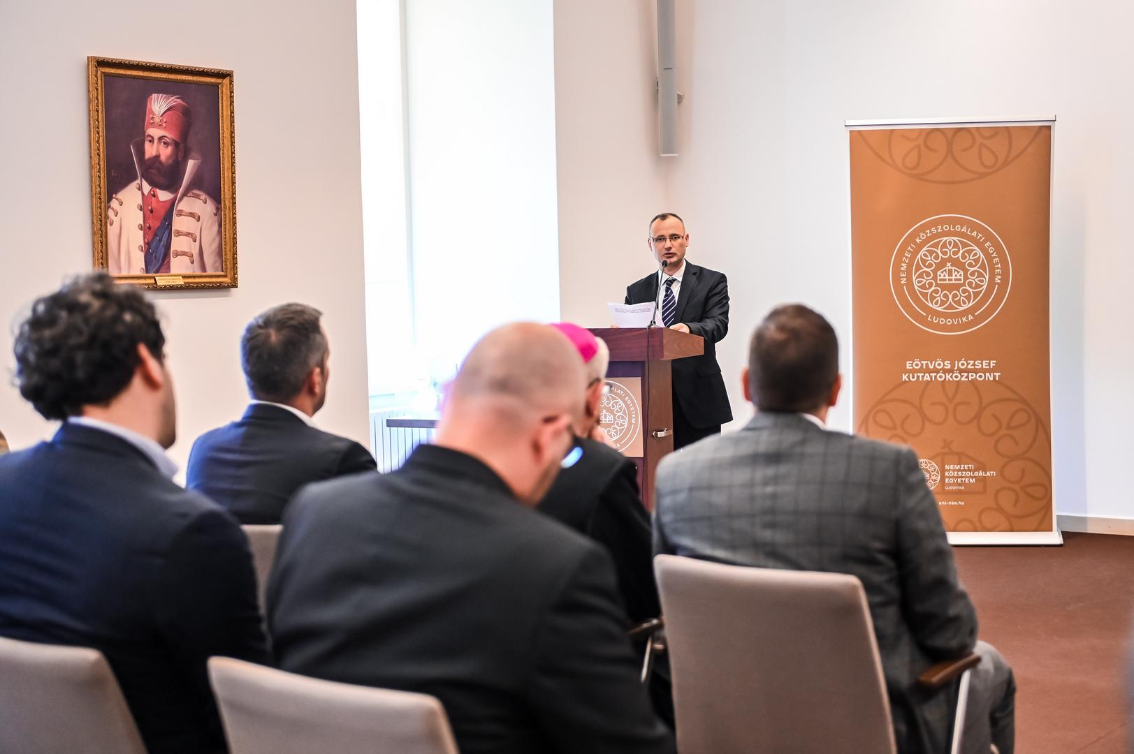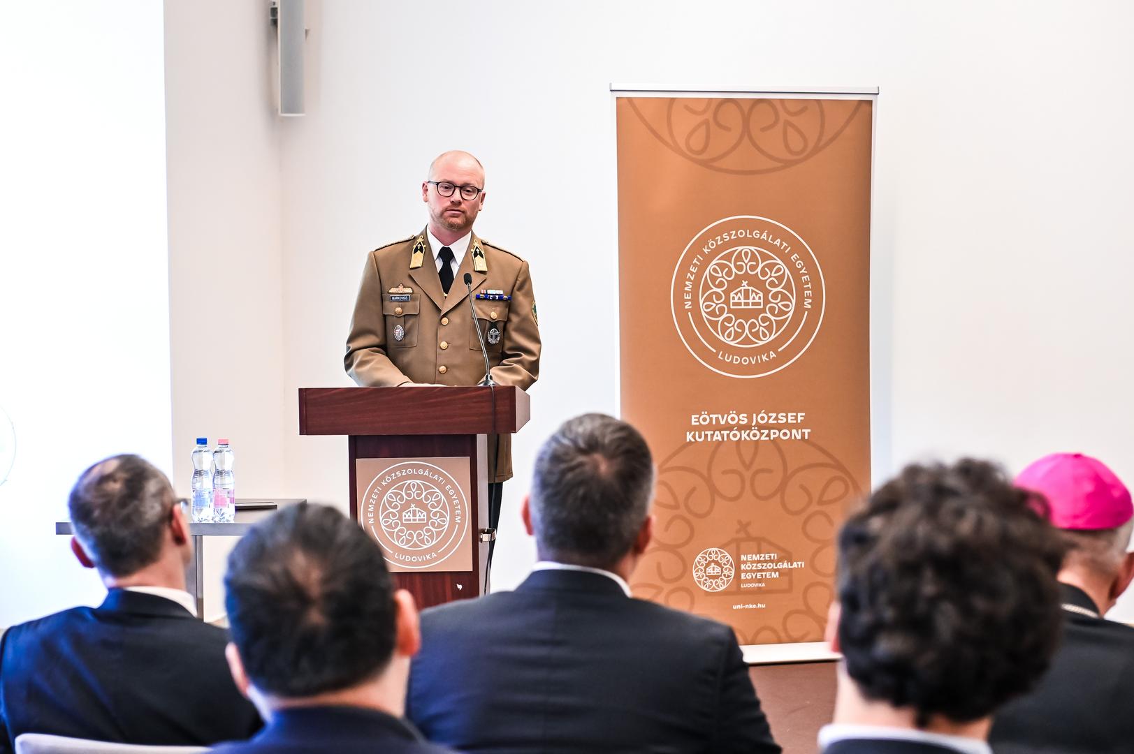 Megnyitójában Deli Gergely rektor arról beszélt, hogy a vallási közösségek küldetéséhez a társadalmi rend alakítása és a béke előmozdítása is hozzátartozik, „a válságkezelésben és a háborúetikai kérdések értékelésében a vallási közösségek helye az elmúlt évtizedekben megerősödött”. Az NKE rektora kiemelte: a katolikus egyház szervezeti struktúrája és komplex etikai, társadalmi tanítása miatt is kiemelkedik a többi vallási közösség közül. „A pápai és a szentszéki dokumentumok nem hagynak kétséget afelől sem, hogy az új típusú biztonsági és a háborúetikai kihívások mögött olyan klasszikus etikai kérdések húzódnak meg, mint az igazságosság, az arányosság, az ártatlanok védelme, a háborút viselő főhatalom” – fogalmazott Deli Gergely, aki kiemelte: a biztonsághoz kapcsolódó egyházi tanítás számos tudományt érint, a Nemzeti Közszolgálati Egyetemen pedig évek óta vannak olyan kutatások, amelyek a Ferenc pápa által is meghirdetett transzdiszciplináris módszerekkel dolgoznak. Ennek kézzelfogható eredménye többek között a Vallás és biztonság kapcsolatának egyes kérdéseiről című tanulmánykötet, az évente kiadott magyar és angol nyelvű mű a keresztényüldözésről, a nemzetközi és hazai konferenciák vagy a területen kibontakozó nemzetközi együttműködések sora. Ilyen az a formalizált megállapodás, amely az NKE és a Katonai Ordinariátus között született. Ebben az ordinariátus számíthat az NKE tudásbázisára, humán kapacitására, az egyetem pedig különösen is számít az egyházi szervezet tapasztalataira, amely hozzájárulhat az intézmény nemzetköziesítéséhez – szögezte le Deli Gergely.