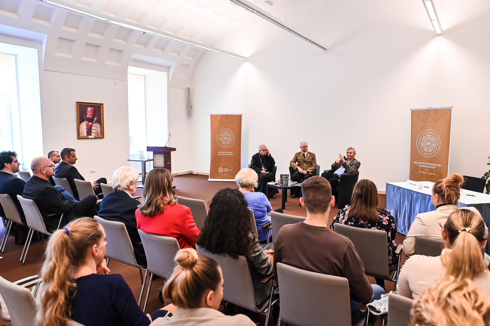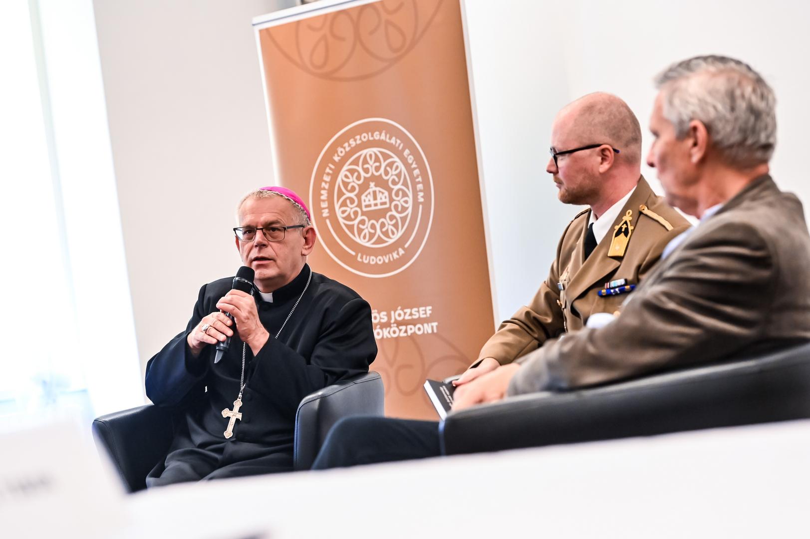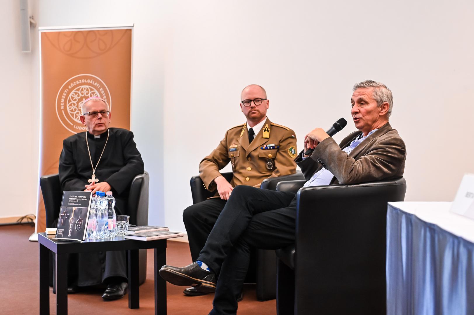Vallási szélsőségek, a vallásszabadság határai, védelmi biztonság a migráció kérdéskörében, a háború fogalma a vallásbölcseletben, az igazságos háború, a Közel-Kelet vallásai, vallásföldrajz, békefilozófiai kérdések – egyebek mellett ilyen témákat járnak körbe azok a tanulmányok, amelyek az eseményen bemutatott a Vallás és biztonság kapcsolatának egyes kérdéseiről című kötetben helyet kaptak. Elhangzott: a mű a Vallás és Társadalom Kutatóintézet vezetője Ujházi Lóránd és kutatója Petruska Ferenc szerkesztésében látott napvilágot, a közreműködő 15 szerző között van például jogász, geológus, filozófus és történész is. A kötet lektora Padányi József vezérőrnagy, a Hadtudományi és Honvédtisztképző Kar egyetemi tanára és a Katonai Műszaki Doktori Iskola vezetője, aki a bemutatón arról beszélt: a mű újdonsága vallás és biztonság kapcsolatának tudományos igényességű vizsgálata, a transzdiszciplinaritás, a különböző tudományterületek összekapcsolása eltérő szemlélettel közelítik meg a témát. Mindezt pedig tapasztalt szerzőgárdával, ami garantálja a minőséget. Az NKE professzora szerint a vallás és társadalom viszonyainak jövője súlyos etikai kérdéseket vet fel kutatási oldalon is. A „távolról ölés”, a drónok megjelenése a hadviselésben átrajzolja annak történetét és megváltoztatja a hadszínteret is. A történelem első évszázadaiban a szárazföldön zajlottak a csaták, később a levegőben, majd a tenger alatt, napjainkban pedig az űr és a kibertér is műveleti terep lett. A következő hadszíntér a „mentális tér” lesz talán – mutatott rá a jövő, etikai kérdéseket is felvető dilemmáira Padányi József. Berta Tibor római katolikus tábori püspök a kötetbemutató kerekasztal-beszélgetésen arra irányította rá a figyelmet, hogy mit tehet az egyén a mostani háborús helyzetben: „Imádkozzon és törekedjen a belső békére” – hangzott a válasz. A vallás és biztonság aspektusairól szóló könyv a világbéke fontosságára is felhívja a figyelmet, amelyet a vallások garantálhatnak, ebben pedig a katolikus egyháznak és a tábori lelkészeknek is szerepe van. Berta Tibor szerint a kötet segítség a szolgálatteljesítő tábori lelkészek számára is, akiknek az a feladata, hogy kísérjék a katonákat útjukon, hogy azok egy misszióban, vagy bárhol a szolgálatuk során megélhessék katolikus voltukat. A háború és béke problematikáját vizsgáló könyv ebben lehet segítség számukra – mondta a tábori püspök.