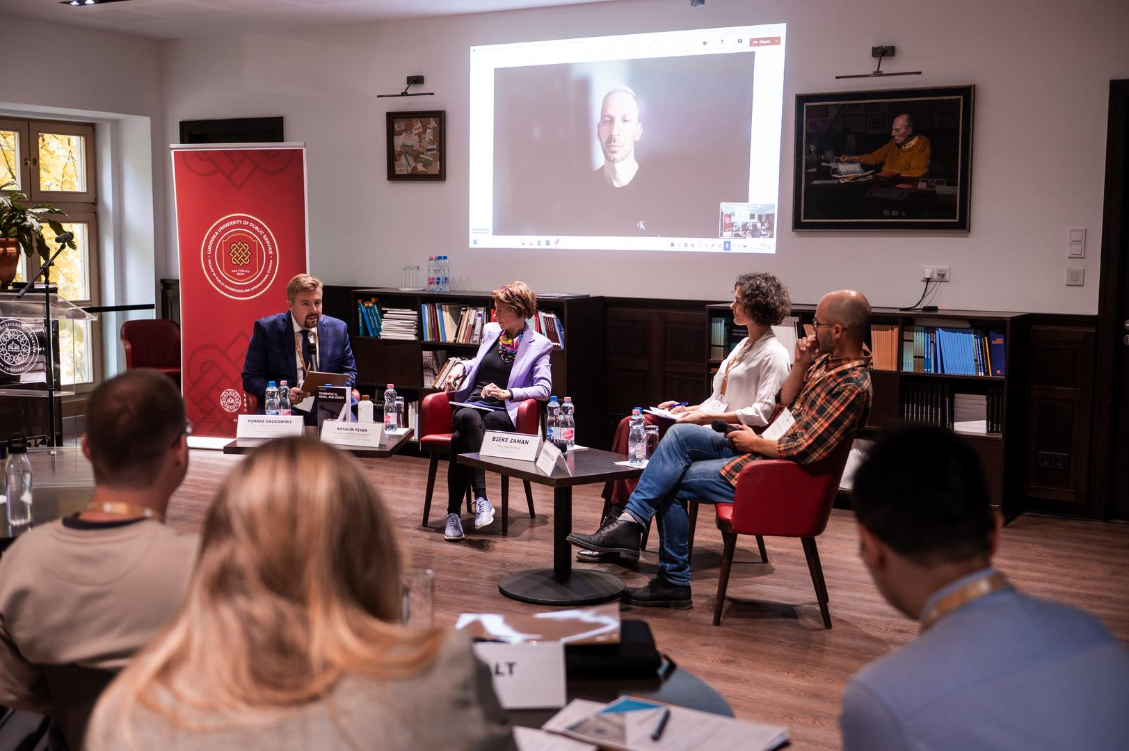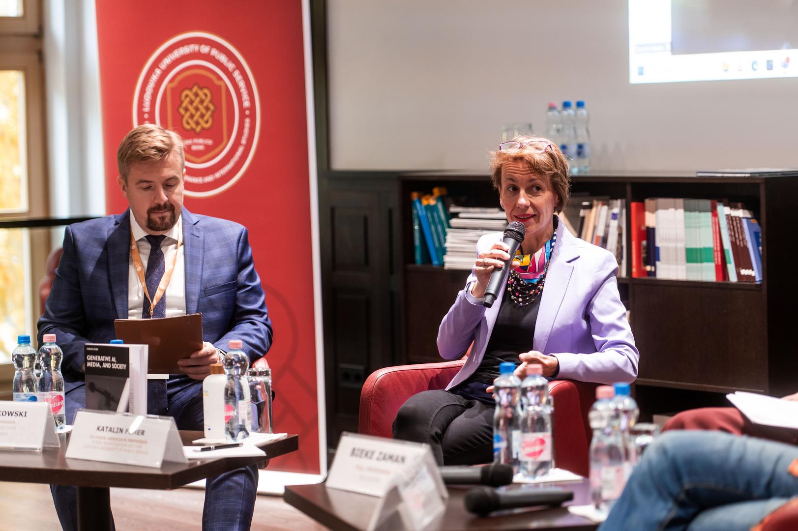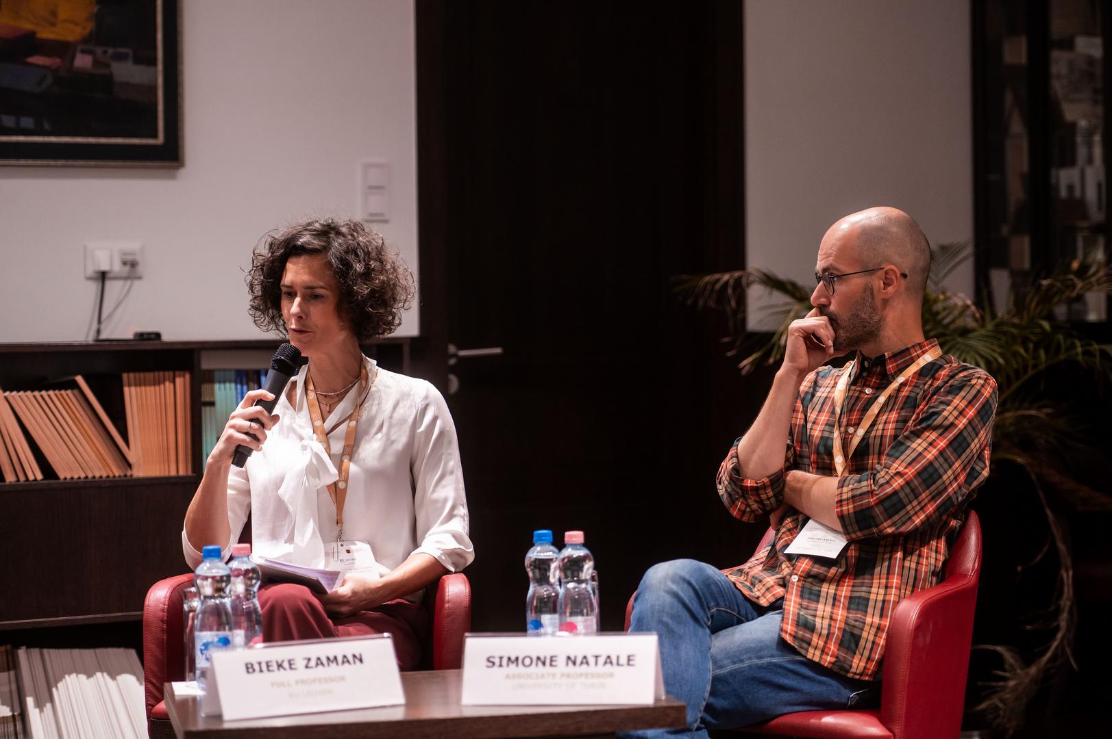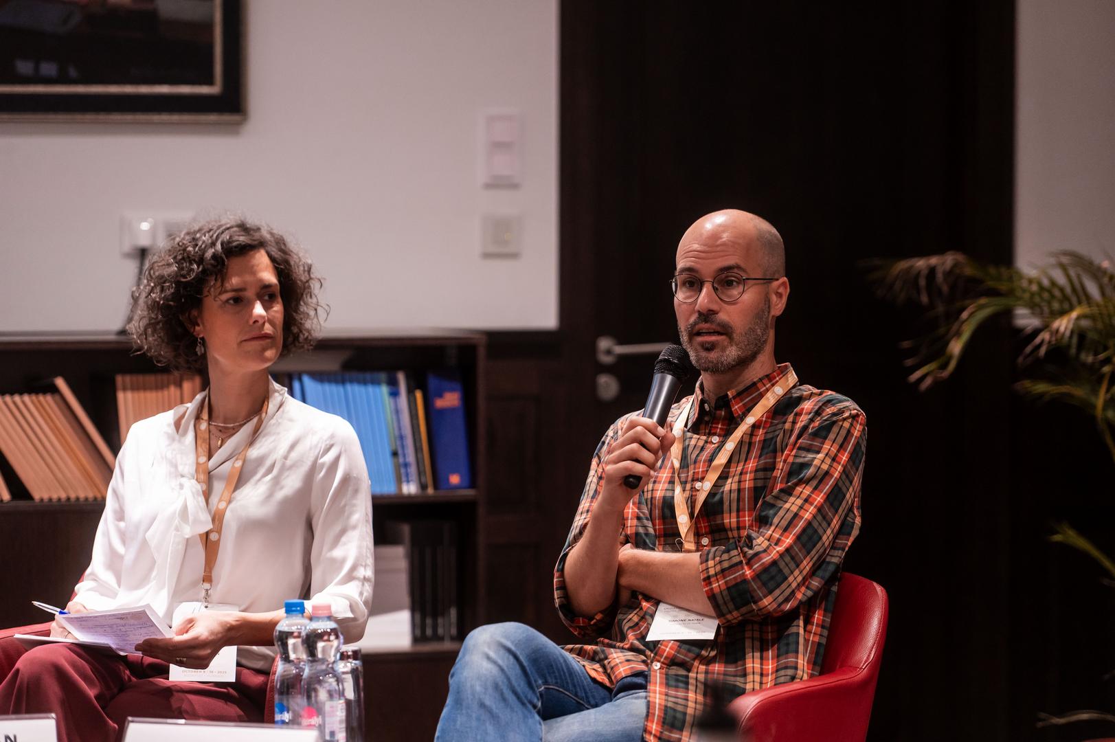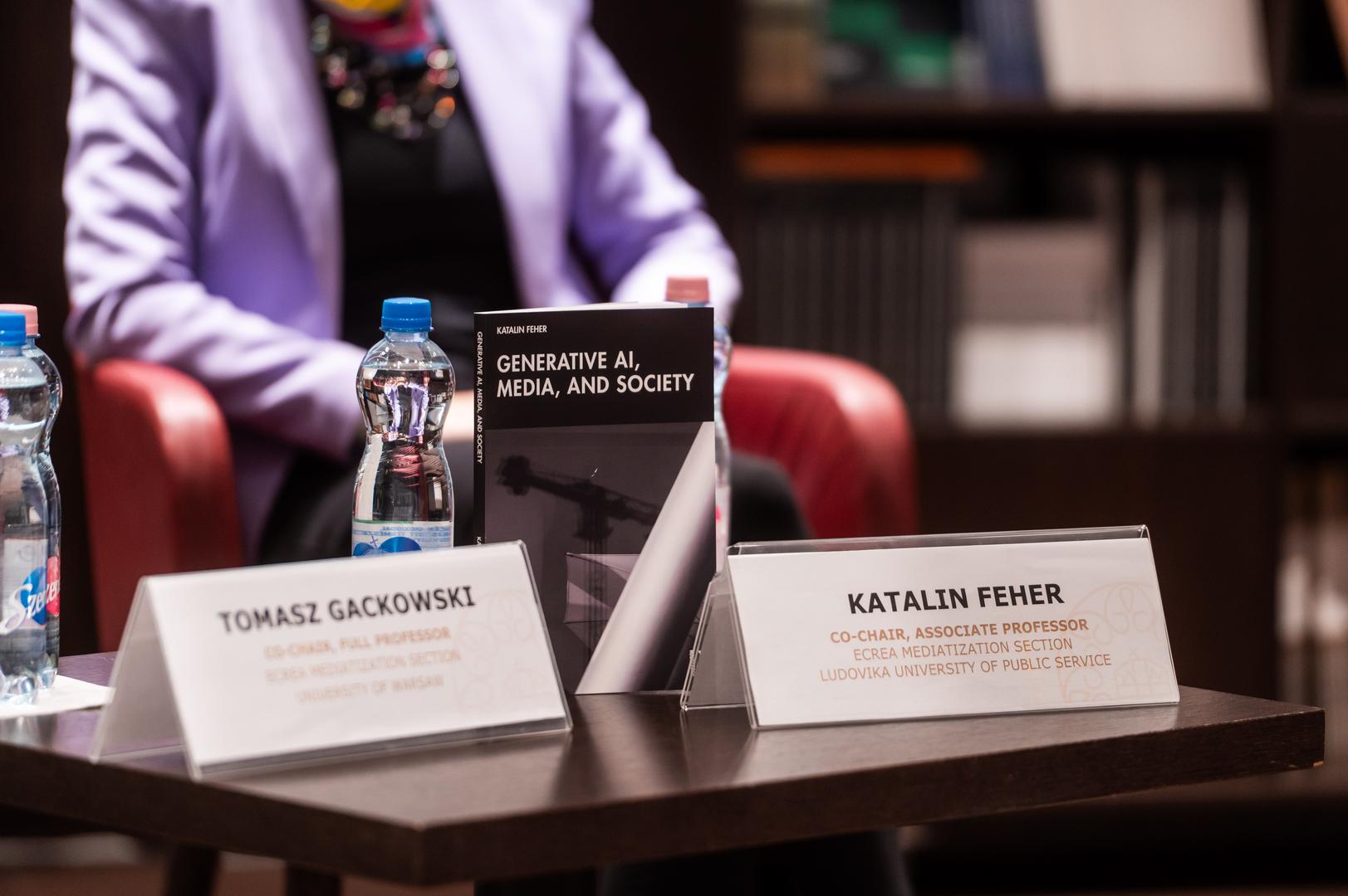 Az előadást egy panelbeszélgetés követte, amelyet Tomasz Gackowski, az ECREA Mediatizáció társelnöke és a Varsói Egyetem professzora moderált, és amelyen Fehér Katalin Társadalom és Technológia című könyvének bemutatója is helyet kapott. A panel résztvevői Simone Natale, Bieke Zaman, a KU Leuven professzora, Demeter Márton, az NKE egyetemi docense és Fehér Katalin voltak. Tomasz Gackowski Simone Natale-hoz intézett kérdéssel indította beszélgetést, hogyan különbözik az MI által gyorsított csalás a hagyományos álhírektől, és hogyan befolyásolja az információterjesztés léptékét? Simone Natale hangsúlyozta, hogy a szándékosság helyett az ügynökségre kell fókuszálni, mivel a szoftverek dinamikái gyakran nem köthetők egyértelmű szándékhoz. Az MI átláthatósága – különösen a nagy nyelvi modellek esetében, amelyek működése még a fejlesztők számára is részben átláthatatlan – tovább bonyolítja a helyzetet. Simone Natale szerint a modelleket természeti jelenségként tanulmányozzák, ami új megközelítést igényel.