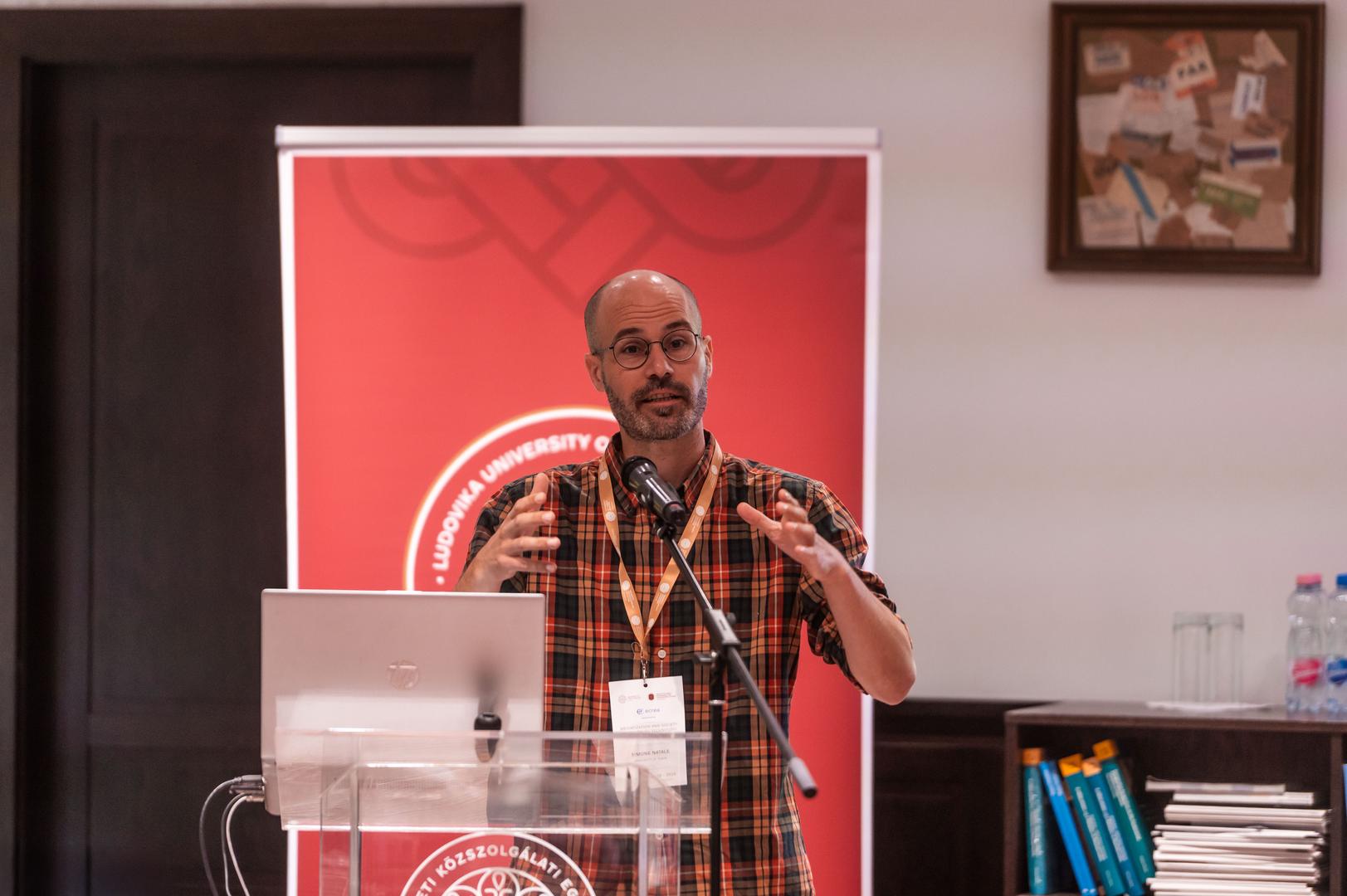 Ezt követően Simone Natale, a Torinói Egyetem docense Mesterséges intelligencia és a megtévesztés automatizálása című nyítóelőadásban a generatív mesterséges intelligencia (MI) térnyerésének hatásait vizsgálta a kommunikációs folyamatok automatizálására a csalás fogalmának átalakulását vizsgálta az MI és a digitális média korában, különös tekintettel a Replika nevű MI-alapú társalkalmazásra. A Replika, amely nagy nyelvi modelleken alapul, hasonlóan a ChatGPT-hez, nem pusztán technológiai eszköz, hanem olyan platform, amelynek célja a társadalmi interakció és sokszor erotikus beszélgetések elősegítése. A felhasználók letöltik az alkalmazást, létrehoznak egy avatárt, meghatározzák annak nevét, nemét és jellemzőit, majd társalgásba kezdenek vele. A digitális média és MI elismert kutatója szerint ez az alkalmazás jól példázza azt az ellentmondásos dinamikát, amely az MI és a felhasználók közötti kapcsolatot jellemzi: bár a felhasználók tudják, hogy egy érzelem- és empátiamentes szoftverrel kommunikálnak, mégis mély, érzelmileg jelentős kapcsolatot alakítanak ki vele. Ez a jelenség nem egyszerű hiszékenység, hanem egy köztes állapot, ahol a tudatosság és az érzelmi bevonódás egyszerre van jelen, újragondolásra késztetve a csalás hagyományos fogalmát.