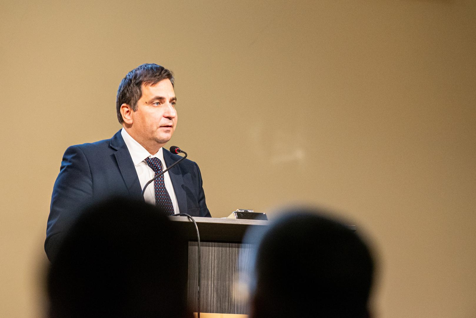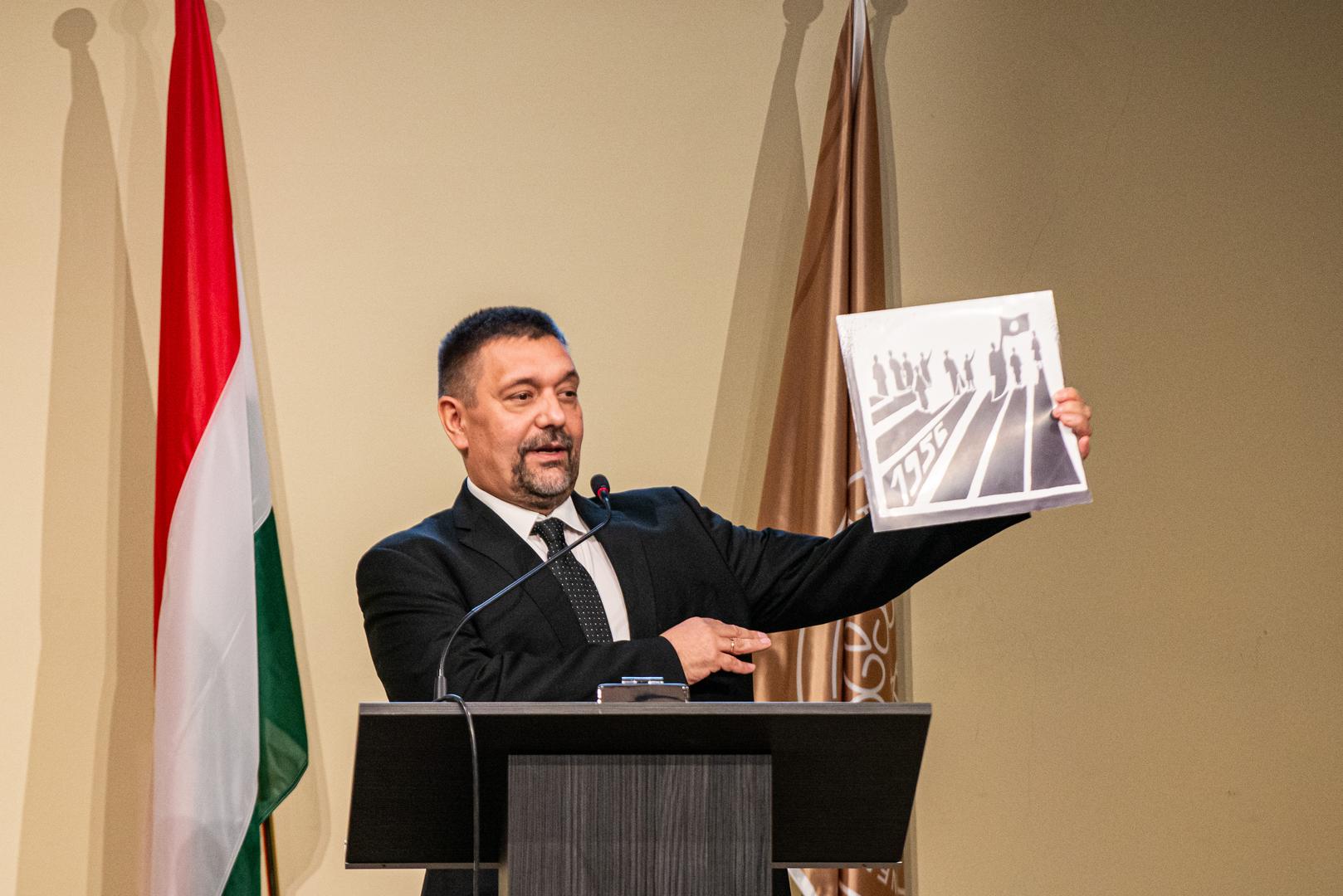 Deli Gergely, az NKE rektora ünnepi beszédében hangsúlyozta, hogy október 23-a a magyar nemzet egyik legszentebb napja, amely arra hív, hogy emlékezzünk azokra, akik tetteikkel a szabadság és a nemzeti önazonosság jelképévé tették ezt a napot. Mint fogalmazott: „Az ünnep mély, elkülönített és megszentelt időt jelent, amelyben – ahogy Hamvas Béla írja – »az ember lehántja magáról Énjét, igazi lényében megnyilatkozik, és a közösségben minden emberrel egyesül«. Ilyen különleges nap a magyar nemzet történetében 1956. október 23-a is.” Kiemelte, hogy az ünnep nem csupán visszatekintés, hanem lehetőség a lelki megtisztulásra és a közösségi összetartozás megerősítésére. A rektor felidézte az 1956-os hősök példáját — diákokat, tanárokat, munkásokat, orvosokat és katonákat, akik a szabadságért vállaltak áldozatot. Külön megemlítette a fiatal hősöket, köztük Tóth Ilonát, Tumbász Ákost, Mansfeld Pétert és Mány Erzsébetet, akik életüket is kockáztatták a hazáért. Deli Gergely rámutatott, hogy bár a forradalom eseményei mára távolinak tűnhetnek, az önfeláldozás, a bátorság és a közösségért vállalt felelősség örök példát jelent. Hangsúlyozta, hogy az ünnep több mint emlékezés: a múlt és a jelen találkozása, amely a jövőnek is üzen, hogy a szabadság nem ajándék, hanem felelősség és szolgálat. „Az a ritka pillanat, amikor a jelen és a múlt egymásra tekint, s üzen a jövőnek is” – fogalmazott Deli Gergely, aki arra buzdított, hogy hálával és büszkeséggel gondoljunk az 1956-os hősökre — ismert és névtelen résztvevőkre egyaránt —, akiknek példája a hűség, a bátorság és a szolgálat időtlen értékét hordozza.