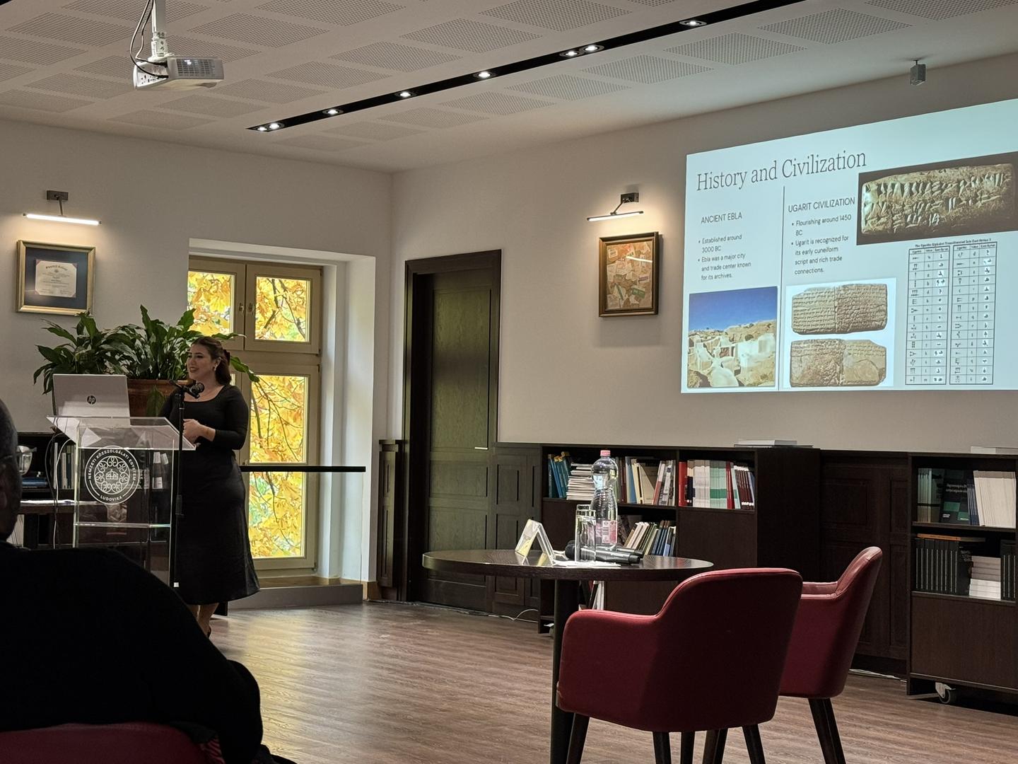 Az első előadást Maria Fayad szír mesterszakos hallgató tartotta, aki részletesen ismertette Szíria gazdag történelmi örökségét, kiemelve az egyik legrégebben lakott területként Ugarit és Ebla ősi civilizációinak nyomait, azok írásrendszereit és vallási hagyományait. Beszélt a szír gasztronómia jellegzetességeiről, valamint a 20. századi kulturális ikonokról, mint Sabah Fakhri énekes, aki a hagyományos arab zenét népszerűsítette és Nizar Qabbani költő, a szír nemzeti irodalom kiemelkedő alakja. Maria Fayad személyes tapasztalataival is gazdagította az előadást, hangsúlyozva a szír vendégszeretet mély kulturális jelentőségét.