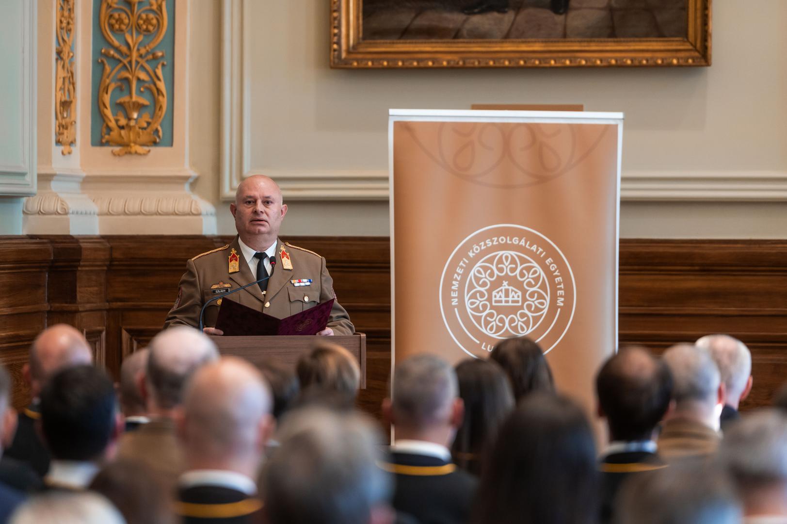 Az ünnepélyes fogadalomtételt és a doktorrá avatást követően Szilágyi Tibor ezredes szólt az avatottak nevében. Az ezredes beszédében kiemelte, hogy a tudásért és a boldogulásért egyaránt meg kell dolgozni: kitartással, elkötelezettséggel és alázattal. „Ezen az úton jártak eleink is, akiknek példája és felhalmozott tudása ma is irányt mutat számunkra, az ő örökségükre építve keressük a válaszokat a világ egyre összetettebb problémáira” – fogalmazott Szilágyi Tibor. Hangsúlyozta: a doktorrá avatás nem lezárása, hanem kezdete egy új szakasznak. Az ezredes felidézte, hogy az avatottak különösen nehéz időszakban – a COVID-járvány, valamint az ukrán–orosz háború árnyékában – kezdték meg tanulmányaikat. Ennek ellenére kitartásuknak és szorgalmuknak köszönhetően olyan tudásra tettek szert, amely innovatív, értékteremtő és a jövőt szolgálja. Végül Kölcsey Ferenc szavait idézve – „Hass, alkoss, gyarapíts, s a haza fényre derül!” – arra buzdított, hogy hiteles példát mutatva, a tudás erejével és felelősséggel szolgálják nemzetünket a frissen avatott doktorok.