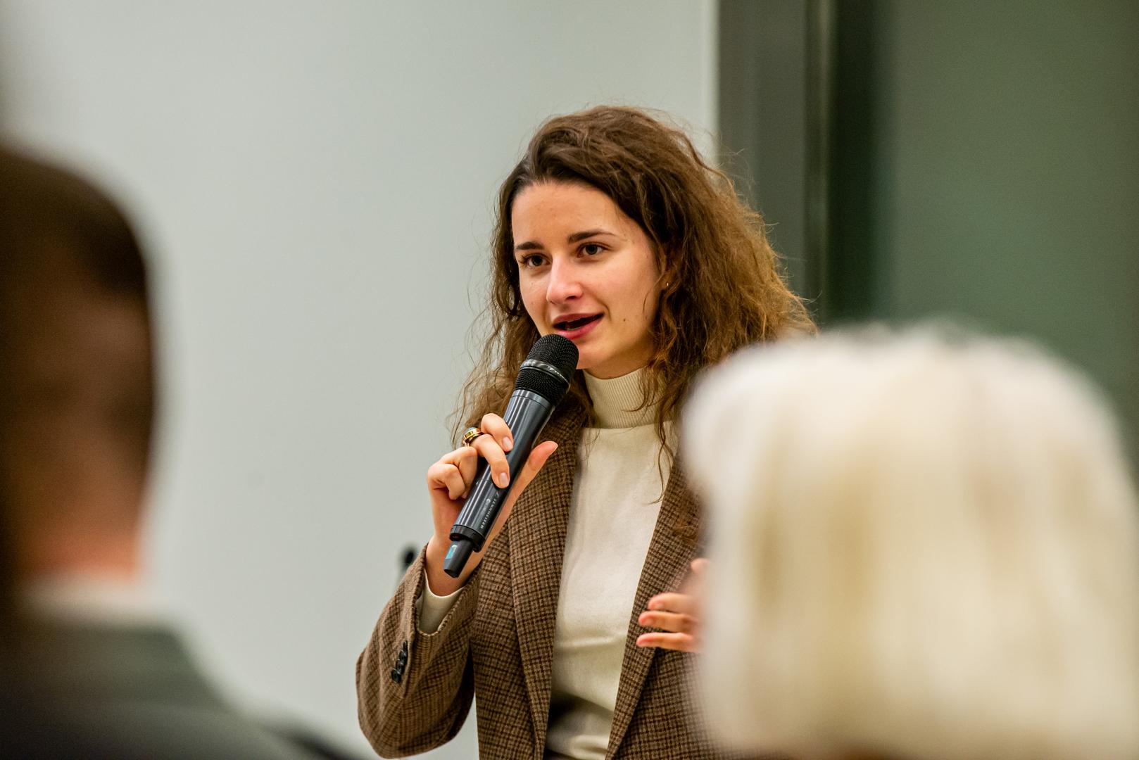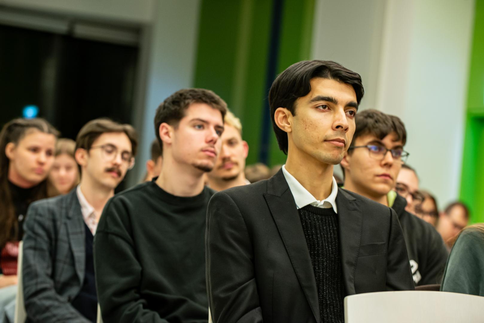 A rendezvény második felében Tomohiko Taniguchi hallgatói kérdésekre válaszolt, e beszélgetést Németh Janka, az NKE Államtudományi és Nemzetközi Tanulmányok Kar (ÁNTK) Nemzetközi és Európai Szakkollégiumának (NESZK) hallgatója moderálta. A professzor itt többek között arról beszélt, hogy a politika és a kormánytisztviselők számára komoly kihívást jelent a lapzártát nem ismerő közösségi média elterjedése. A közvélemény ilyetén mesterséges befolyásolása egyre súlyosabb hadszíntérnek számít a világban. Arról is szólt, hogy a politikusok és véleményformálók korábban hittek a nyelvi akadályokban, így akár eltérő üzeneteket is formálhattak a saját nyelvükön, mint angolul. Ma azonban a szövegek instant fordíthatók, ebben pedig kiemelkedik a mesterséges intelligencia szerepe.