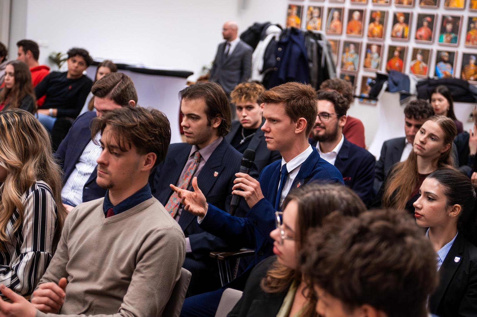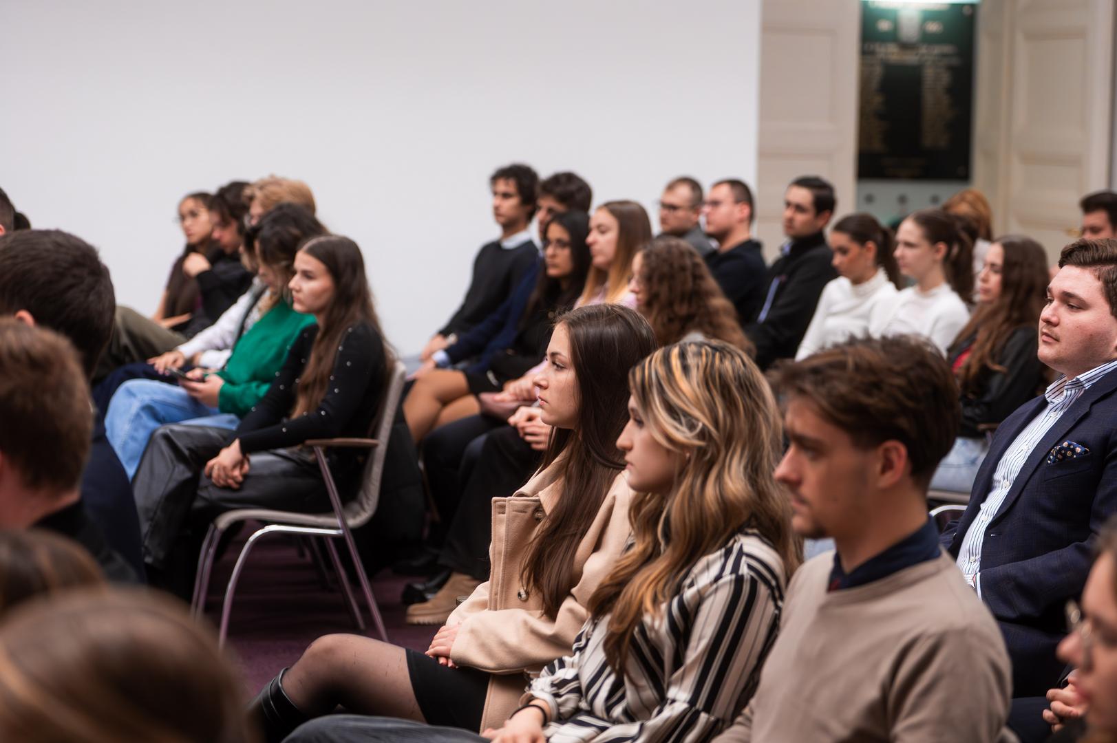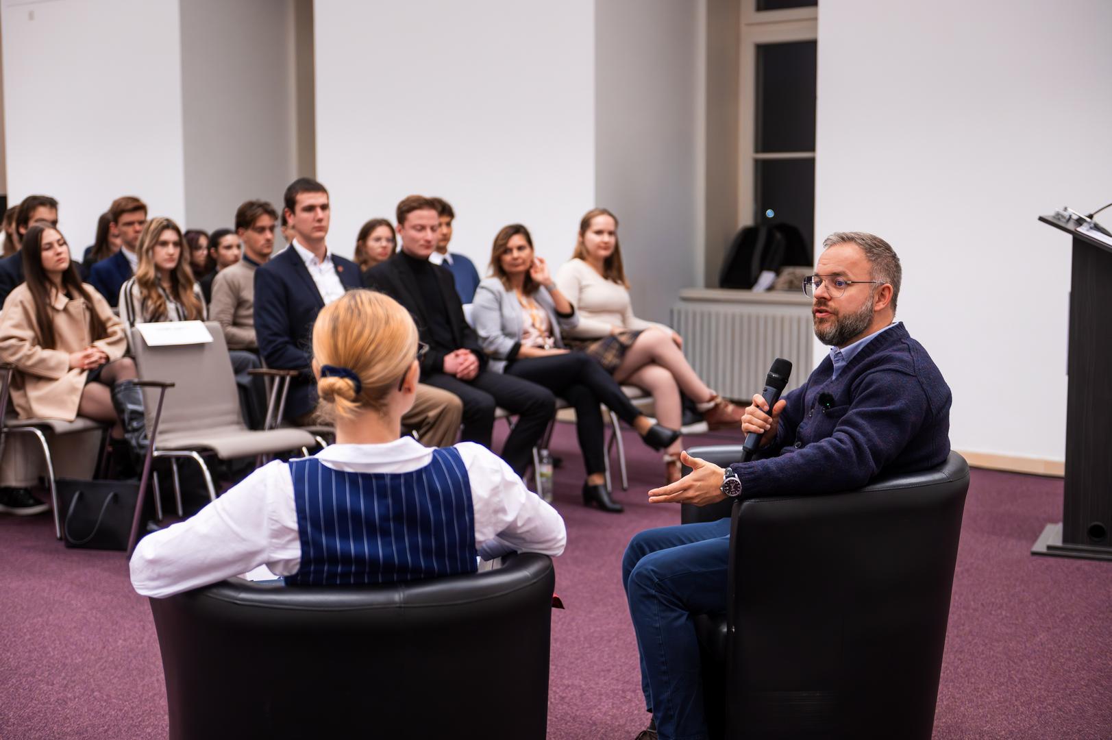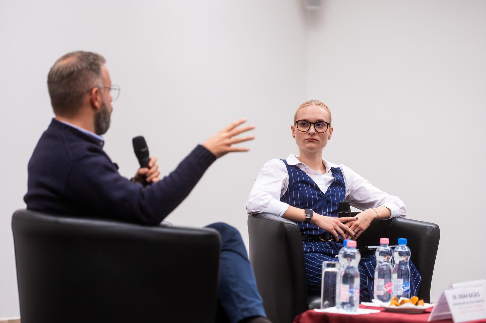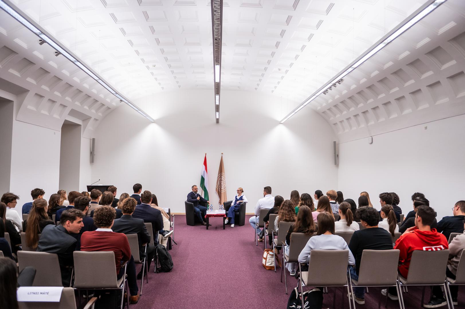 Kitta Annamária, a Ludovika Tehetséggondozó és Tudományos Képességfejlesztési Iroda vezetője köszöntötte a hallgatókat és elmondta, a Nemzeti Közszolgálati Egyetem (NKE) küldetése, hogy a köz szolgálata iránt elkötelezett, felelős döntések meghozatalára alkalmas szakembereket képezzen, s ebben a szakkollégiumoknak kiemelt szerepük van. Ezt követően került sor arra a beszélgetésre, amelyben Barba Réka, az NKE Nemzetközi és Európai Szakkollégium elnöke kérdezte Orbán Balázst, a miniszterelnök politikai igazgatóját, az NKE Tanácsadó Testületének elnökét.