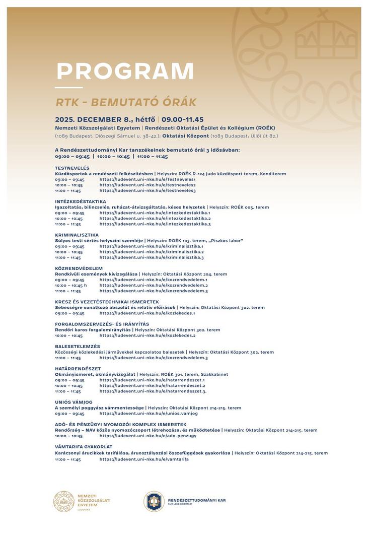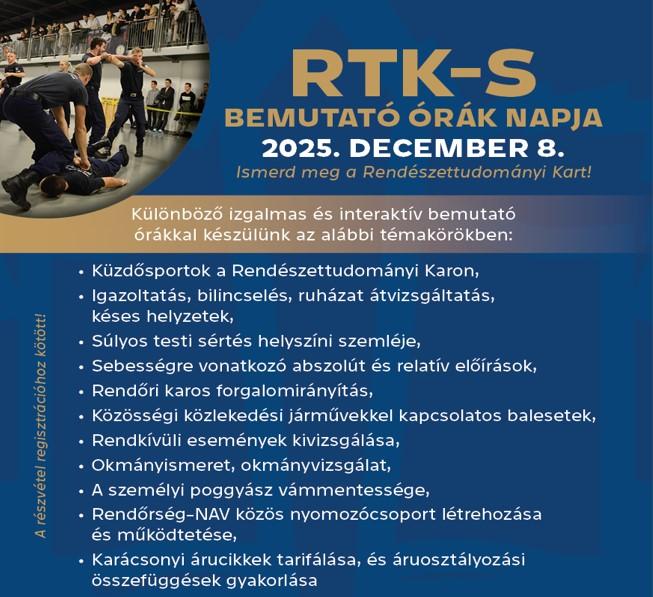 A Nemzeti Közszolgálati Egyetem Rendészettudományi Kara szeretettel meghívja a középiskolás diákokat az „RTK-s bemutató órák napjára”, december 8-ra.
