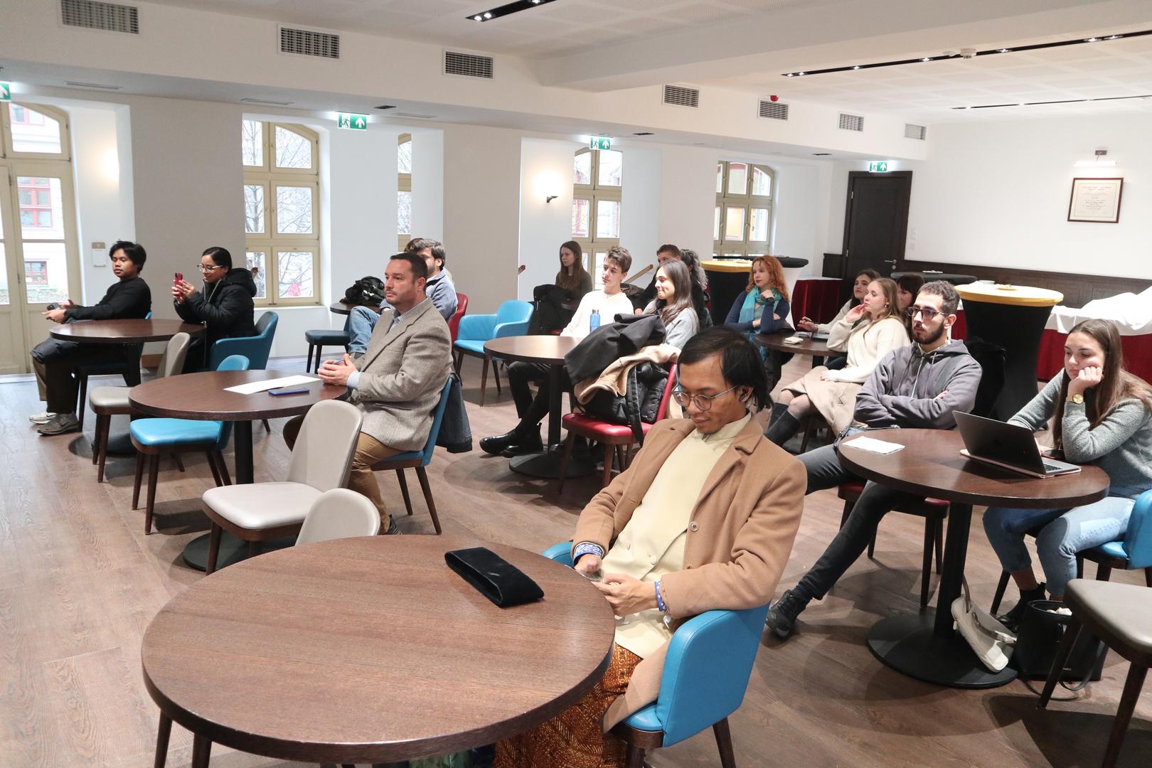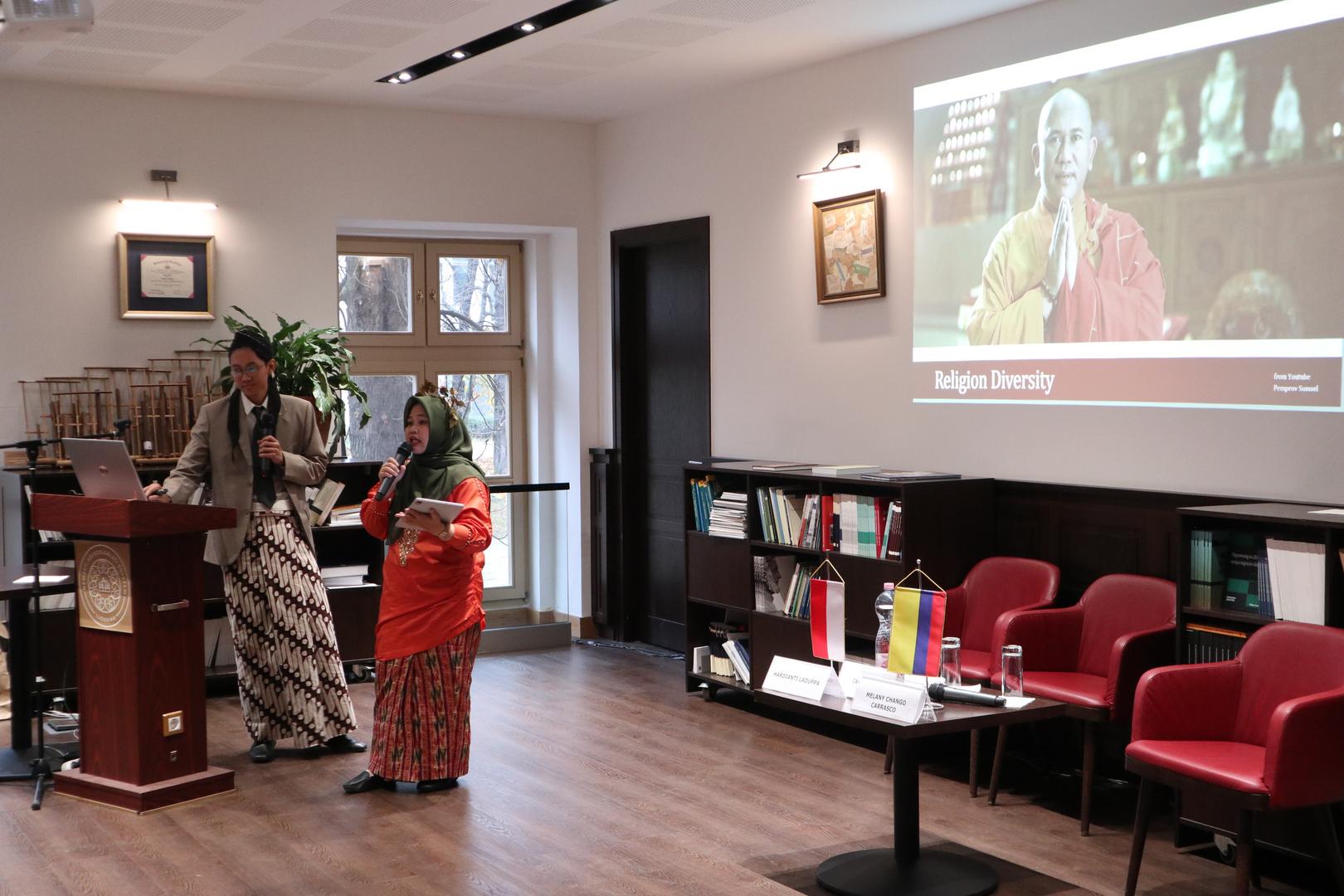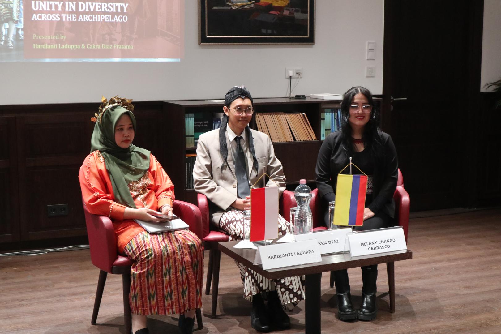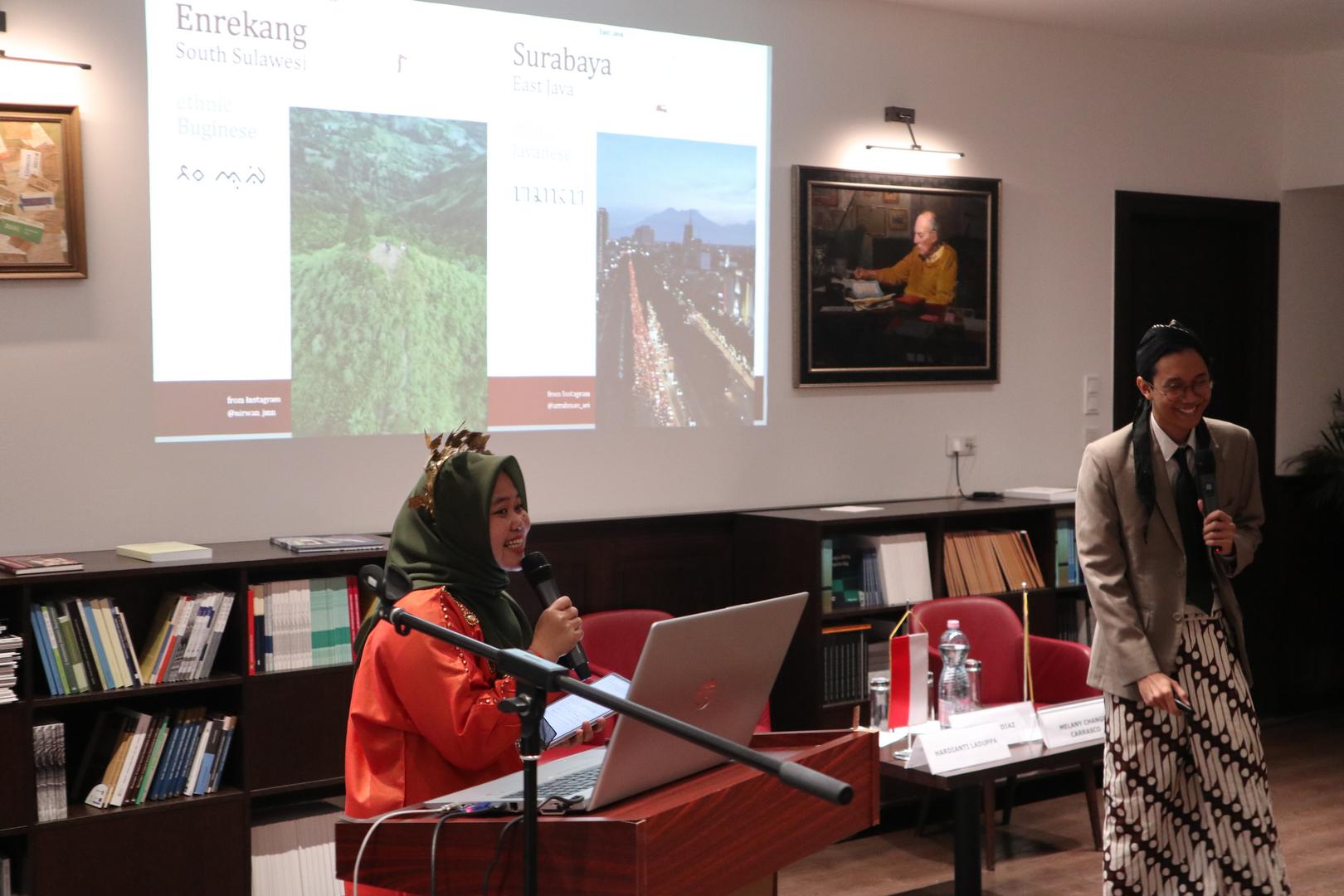 Hardianti Laduppa, az NKE Közigazgatás-tudományi Doktori Iskola elsőéves hallgatója és Pratama Cakra Diaz, a Nemzetközi Kapcsolatok mesterképzés másodéves hallgatója Indonéziát ismertették. A nemzeti viseletben megjelenő előadók egymást váltva mutatták be saját helyi kultúrájukat és társadalmi szokásaikat. A több száz etnikum, a 6 hivatalos nyelv és a regionális önrendelkezés ellenére 1928-tól beszélhetünk egységes Indonéziáról, ahol a helyi közösségek mai napig segítik egymást. A hallgatók két indonéz tulajdonságra is felhívták a figyelmet: a sungkanra és a legawara. Az első azt jelenti, hogy maximális tiszteletadással nem hozzuk zavarba a másik személyt és lehetőleg nem kérünk rajta számon semmit. A másik kifejezésre magyarul azt mondhatnánk, hogy a nemet mondás képességének a hiánya. Még ha nagyon nehéz időszakon megy éppen keresztül egy indonéz ember, akkor is nyílt szívvel mond igent egy felkérésre. Az előadást egy zenei előadás zárta, melyben a jól ismert Tavaszi szél című népdalt játszotta el egy együttes az angklung hangszeren, amelyet a közönség a helyszínen ki is próbálhatott.