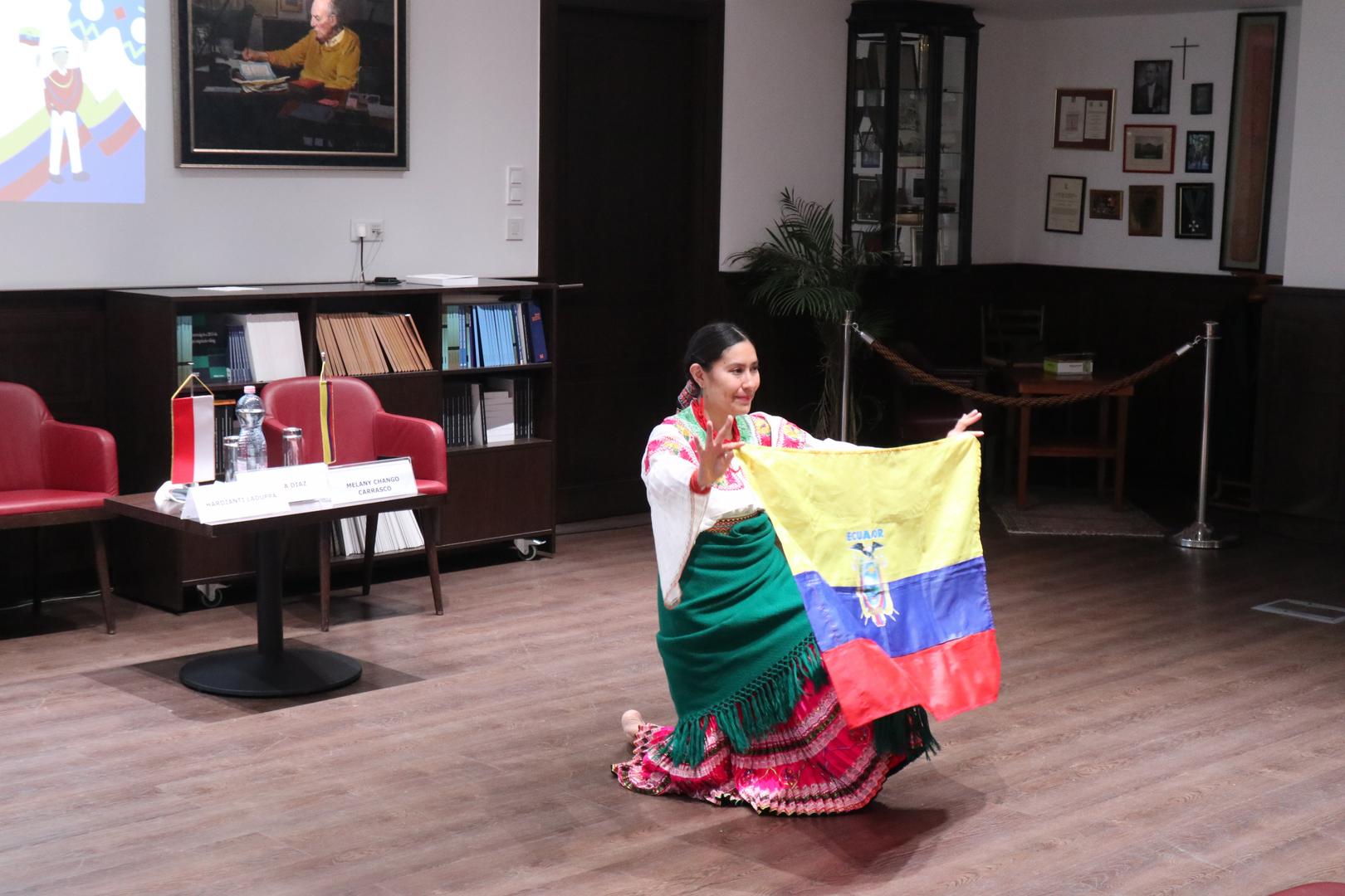 Melany Jhadira Chango Carrasco, a Nemzetközi Vízpolitika és Vízdiplomácia mesterképzés elsőéves hallgatója Ecuadorról beszélt. Mint mondta, az ország a második legmagasabban fekvő területen helyezkedik el. A dél-amerikai ország keletkezésének mitológiájáról is hallhattunk: e szerint egy szerelmi történetből eredeztetik a természeti kincsüknek számító hegységeket, melyek segítenek az országban a földrajzi eligazodásában. Számos őshonos állat és növényfajjal találkozhattunk virtuálisan, és megtudhattuk azt is, hogy Ecuador az orchideák országa, valamint hogy jó néhány vulkanikus eredetű tó, hegység és vízesés is található a területen. Szó esett híres ecuadori sportolókról és zenészekről, valamint arról, hogy az Amazonas területén a rovarok jóval nagyobbak az Európában találhatóknál és itt is kezd divatba jönni a rovarevés. A fennsíkon található részen a sült tengerimalac is elterjedt étel, valamint a főzőbanán (plantain) is nagy népszerűségnek örvend. Rátérve a helyi nyelvre, ami a kichwa, megtudhattuk, hogy köszönés helyett bókokat használnak. Az előadást egy látványos, nemzeti viseletben tartott táncelőadás zárta.