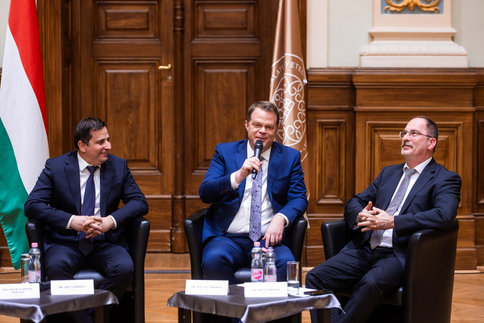 A folytatásban az NKE rektorai cseréltek eszmét: Patyi András egyetemi tanár, alkotmánybíró, Koltay András kutatóprofesszor, a Nemzeti Média- és Hírközlési Hatóság (NMHH) elnöke, valamint Deli Gergely egyetemi tanár, az egyetem jelenlegi rektora idézte fel az intézmény fejlődésének meghatározó időszakait. A beszélgetést Kovács Endre Miklós címzetes egyetemi docens, az NMHH stratégiai igazgatója moderálta.