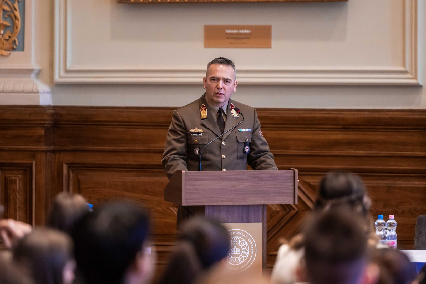Petruska Ferenc, a Hadtudományi és Honvédtisztképző Kar (HHK) nemzetközi dékánhelyettese elmondta, hogy a katona ma már együtt dolgozik civilekkel, rendvédelemmel, hírszerzéssel. Kiemelte a hibrid fenyegetések és a kognitív hadviselés szerepét. A képzés értékalapú jellegét hangsúlyozta, majd részletezte a tisztképzés rendszerét: a HHK-n létezik az egyetlen katonai képzés Magyarországon, amely több mint 200 éves hagyománnyal bír, alap, mester és doktori képzések is elérhetők, a tantervet pedig összehangolják a minisztériummal.