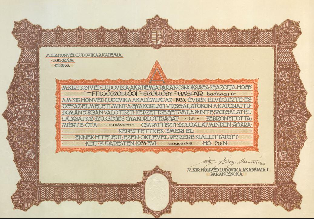 A mindenkori frissen avatottak előtt tisztelegve álljon itt egy olyan oklevél a Nemzeti Közszolgálati Egyetem Egyetemi Könyvtára által gondozott Közszolgálati Tudásportál Ludovika Gyűjteményéből, melyet napra pontosan 90 évvel ezelőtt, 1933. augusztus 20-án állított ki vitéz Jány Gusztáv ezredes, a Ludovika Akadémia I. Főcsoportjának parancsnoka felsőszöllősi Szöllősy Gáspár hadnagy úr részére.